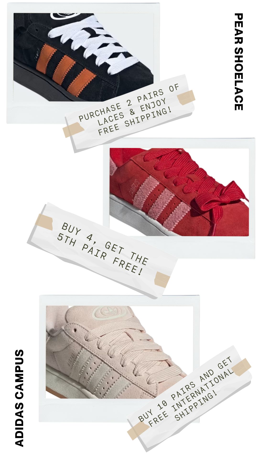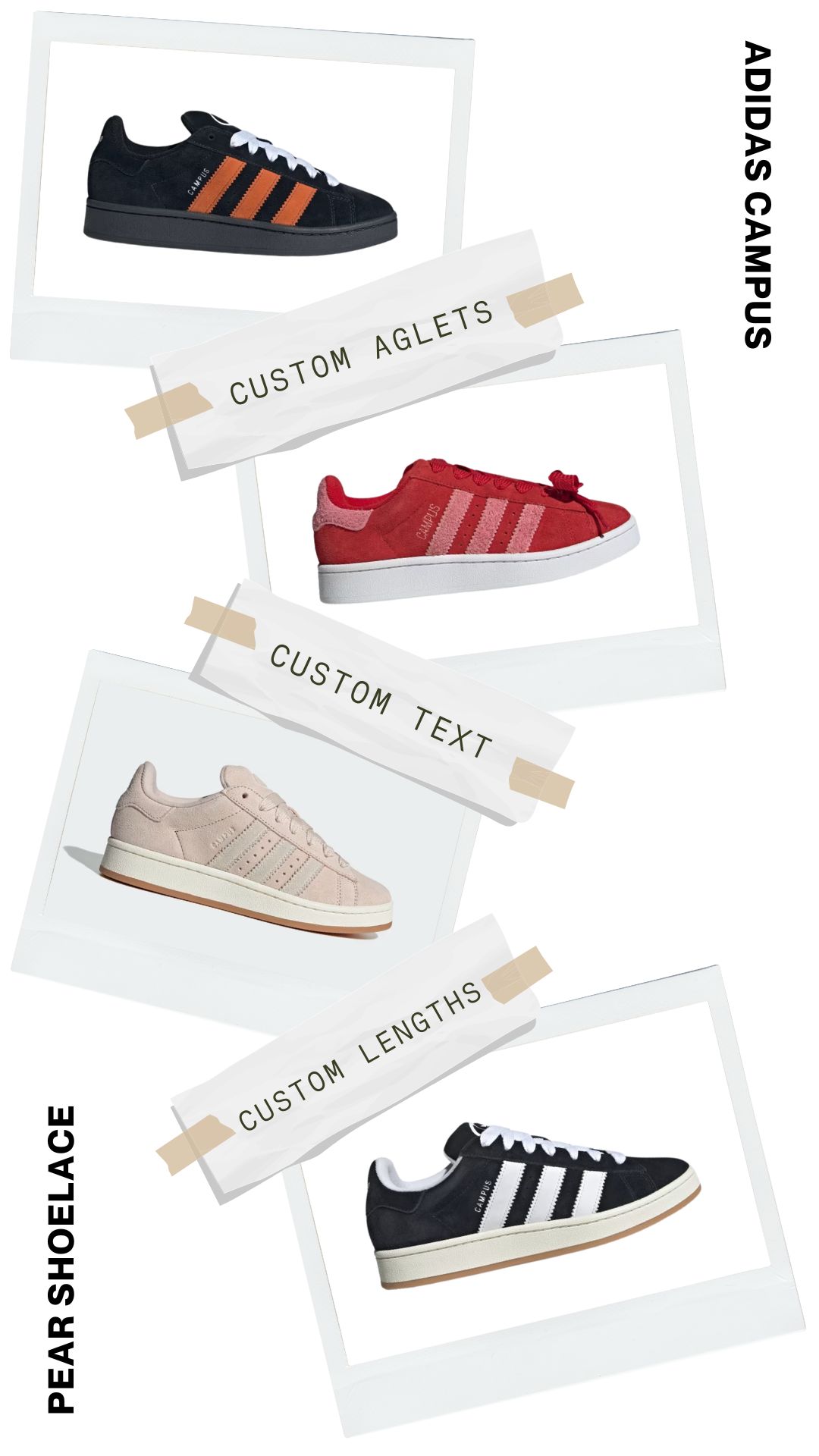 No more dealing with laces that are too long or too short. Pear Shoelaces offers custom lengths tailored explicitly for your Adidas Campus sneakers, ensuring a perfect fit. Enjoy the ideal combination of comfort and style with laces made just for you.