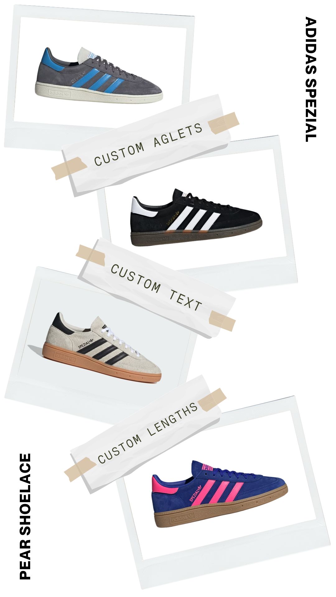 Personalise your Adidas Spezial with custom text on your laces. Whether it's your name, a motivational quote, or a distinctive design, Pear Shoelaces let you express your individuality and make your sneakers one-of-a-kind.