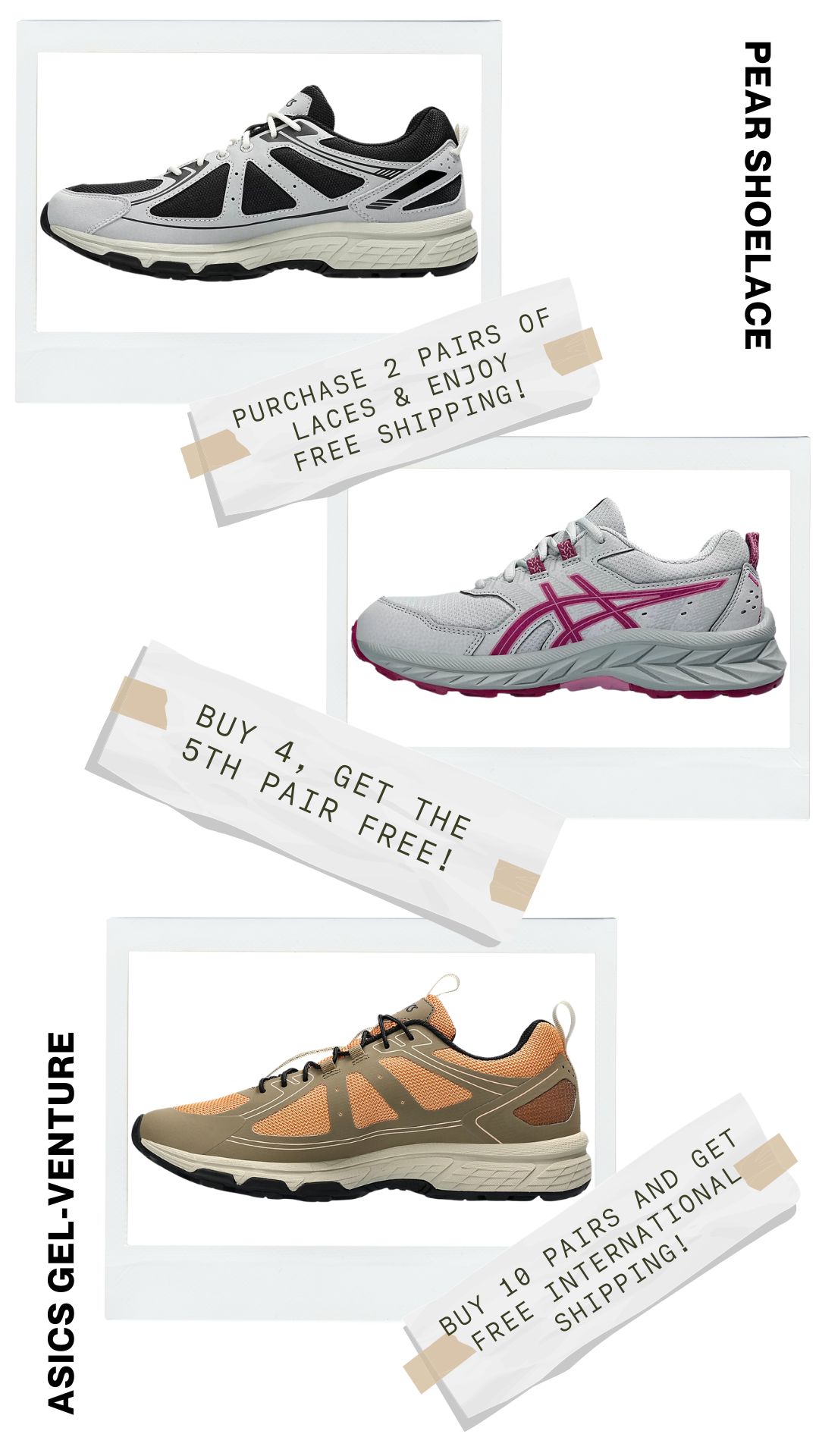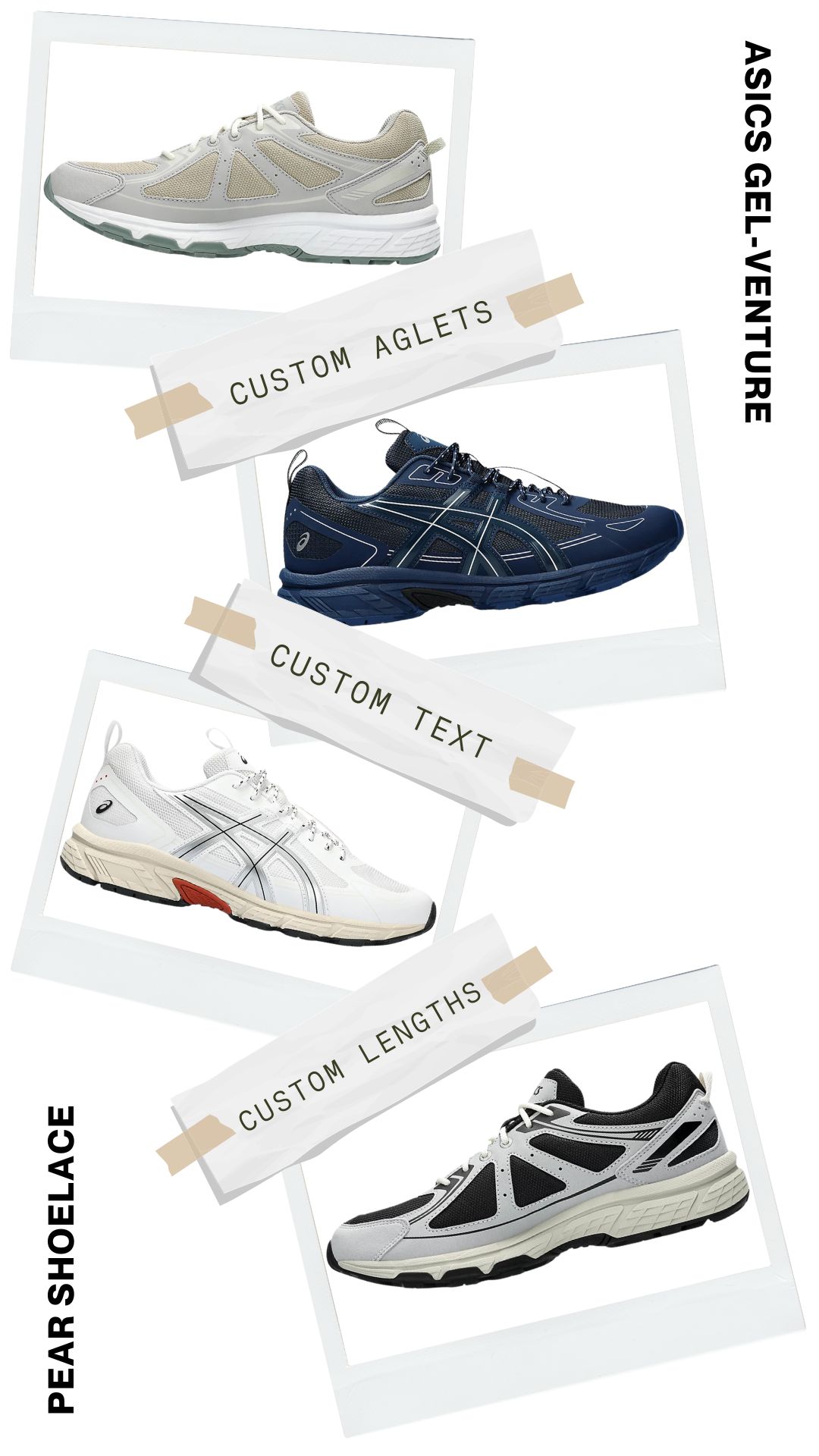 Upgrade your Asics Gel-Venture with our premium, customisable shoelaces. Explore our collection to find the perfect pair that matches your style. Shop now and give your sneakers the personalised touch they deserve with Pear Shoelaces!