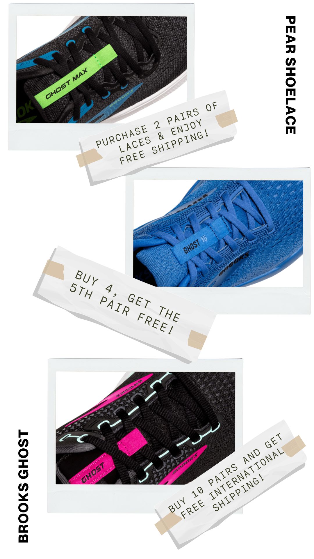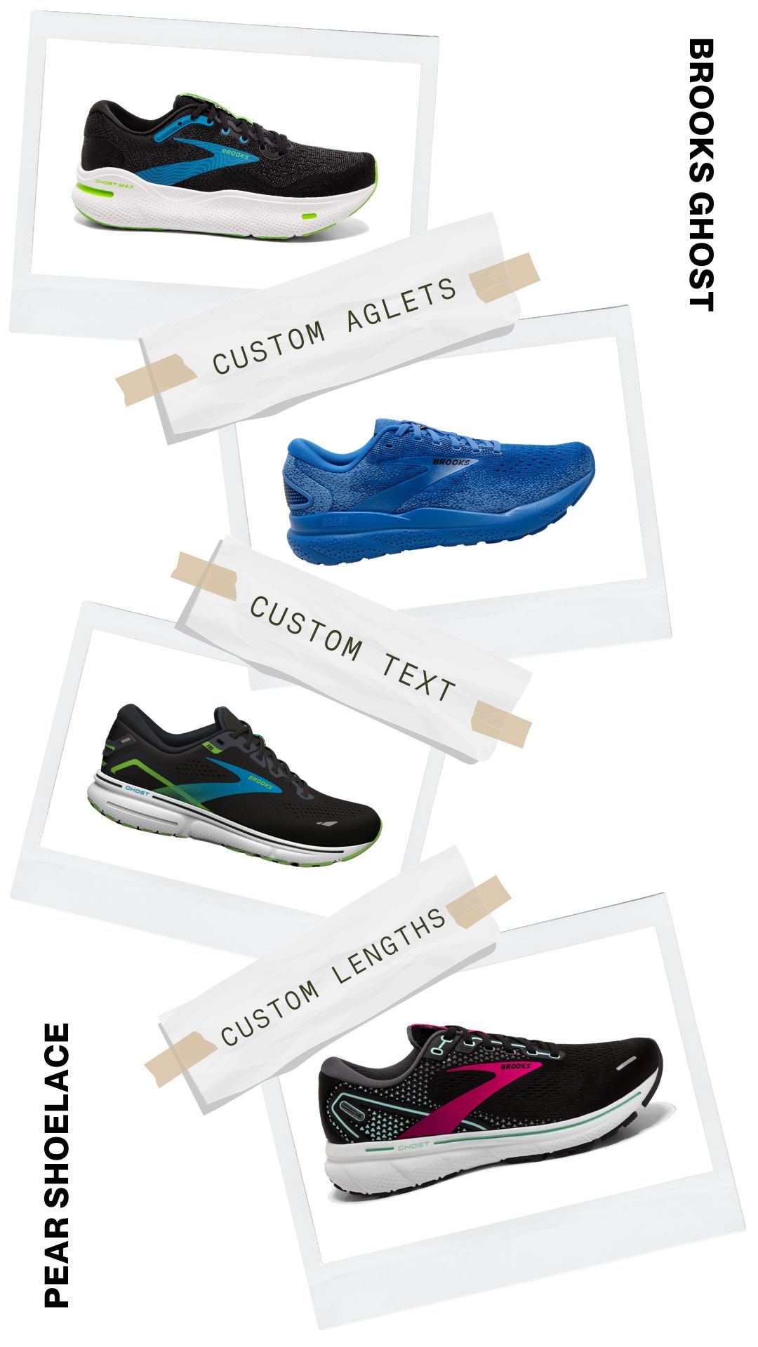 No more dealing with shoelaces that are too long or too short. Pear Shoelaces offers custom lengths explicitly tailored for your Brooks Ghost sneakers, ensuring a perfect fit every time. Experience the ultimate combination of comfort and style with laces made just for you.