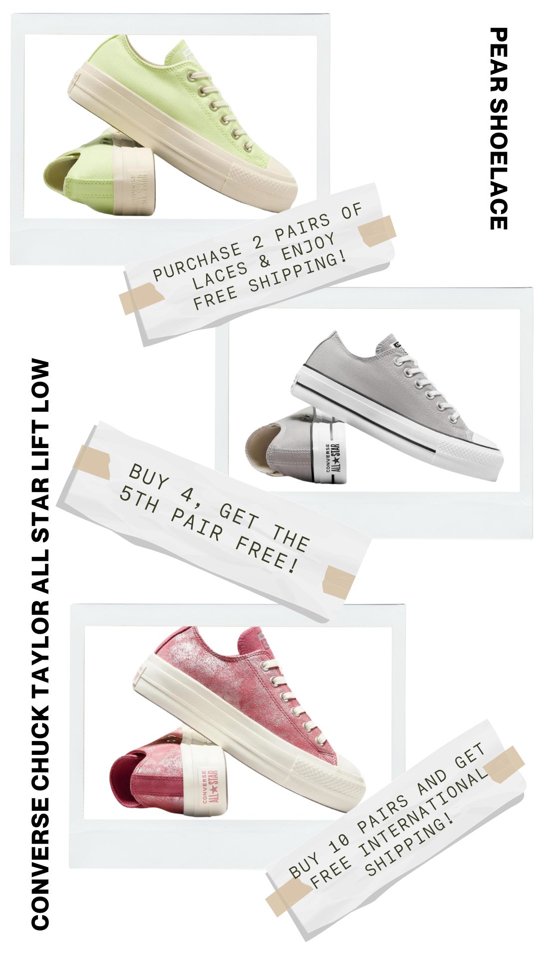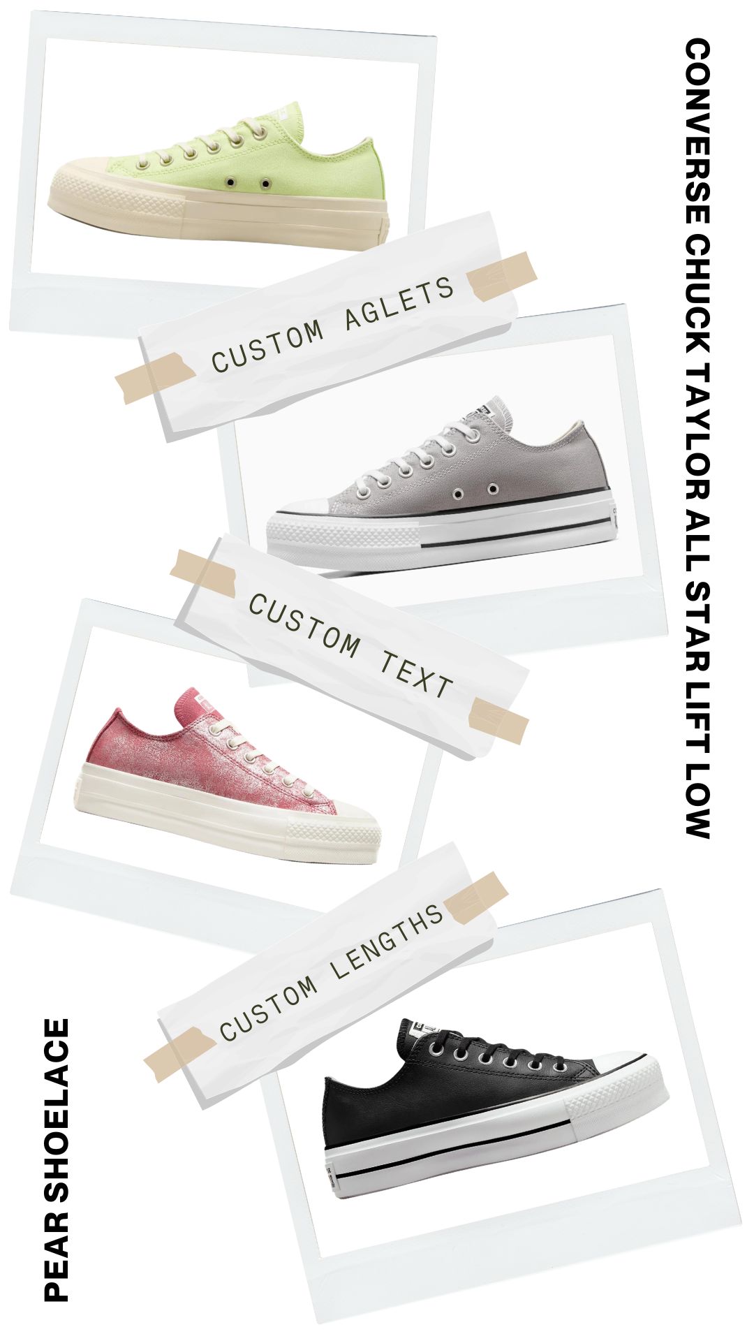 Upgrade your Converse Chuck Taylor All-Star Lift Low Top with our premium, customisable shoelaces. Explore our collection to find the perfect pair that matches your style. Shop now and give your sneakers the personalised touch they deserve with Pear Shoelaces!