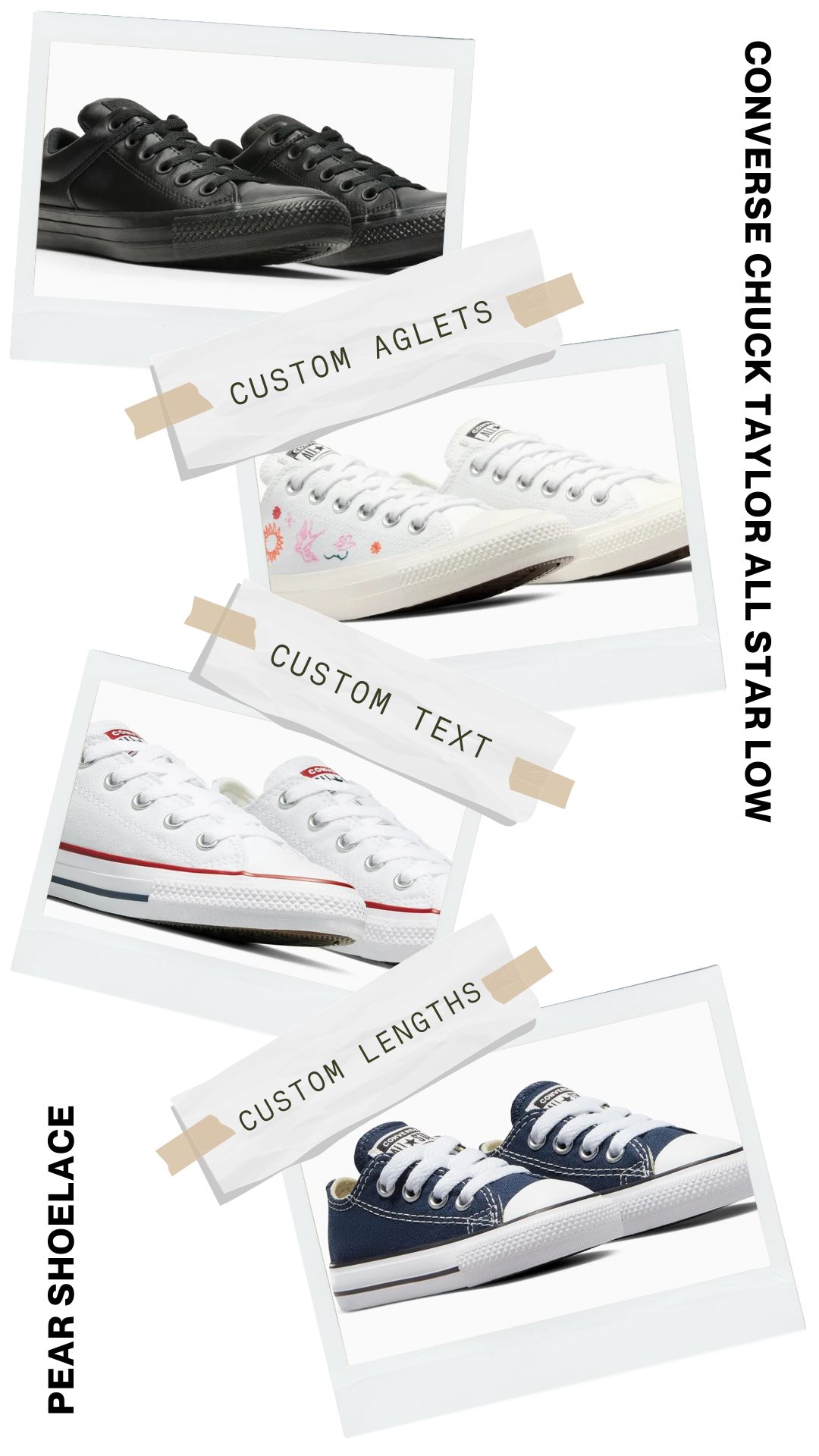 Say goodbye to ill-fitting laces with Pear Shoelaces. We offer custom lengths explicitly tailored for your Converse Chuck Taylor All Stars, ensuring a flawless fit every time. Experience the perfect blend of comfort and style with laces designed just for you.