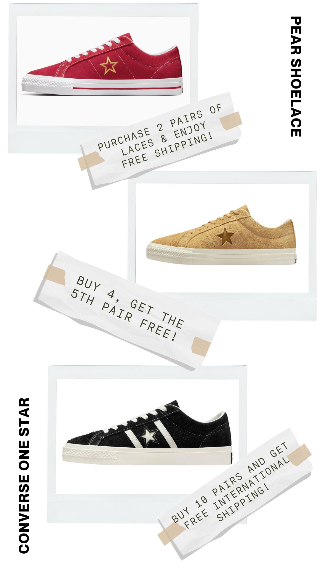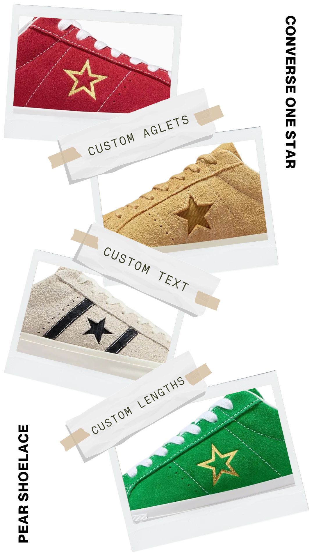 Say goodbye to ill-fitting laces with Pear Shoelaces. We offer custom lengths explicitly tailored for your Converse One Star, ensuring a perfect fit every time. Enjoy the comfort and style of laces that are just the right length.