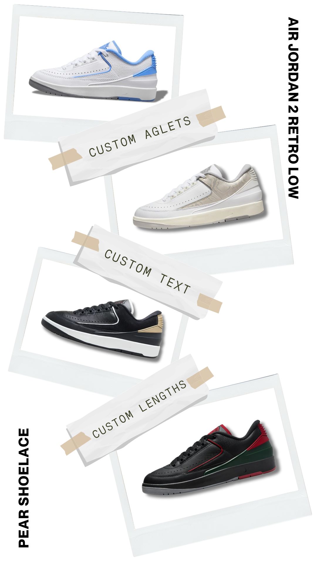 Empower your style with our range of customisable Air Jordan 2 Retro sneakers options. Choose from various colours and aglet designs to match your unique style. Our custom-length service ensures a perfect fit for all sizes, allowing you to express your individuality with every step.