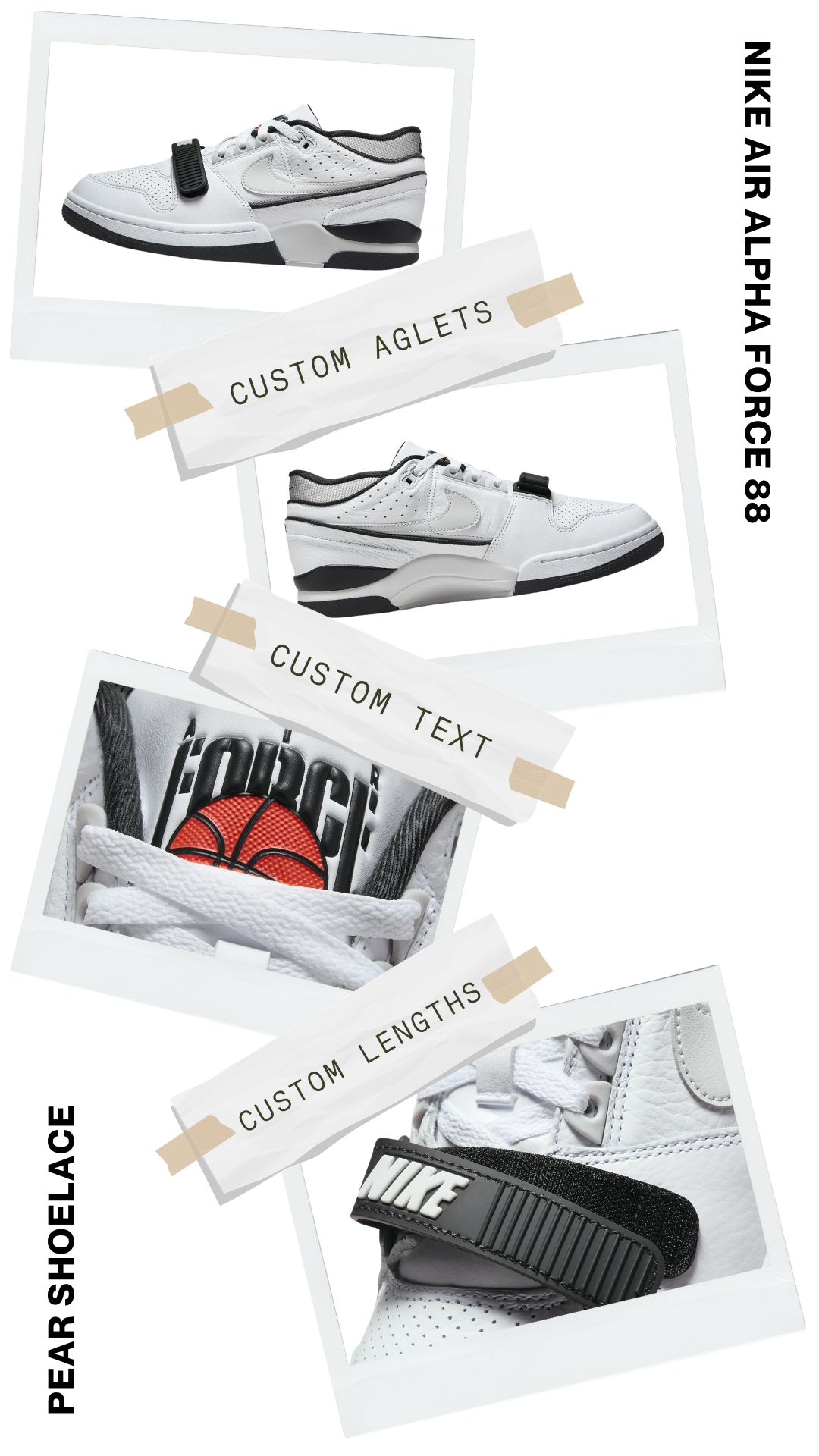 Express your unique style by adding custom text to your shoelaces. Whether it’s your name, a motivational quote, or something entirely personal, Pear Shoelaces lets you customise your Nike Air Alpha Force 88, making them one-of-a-kind.