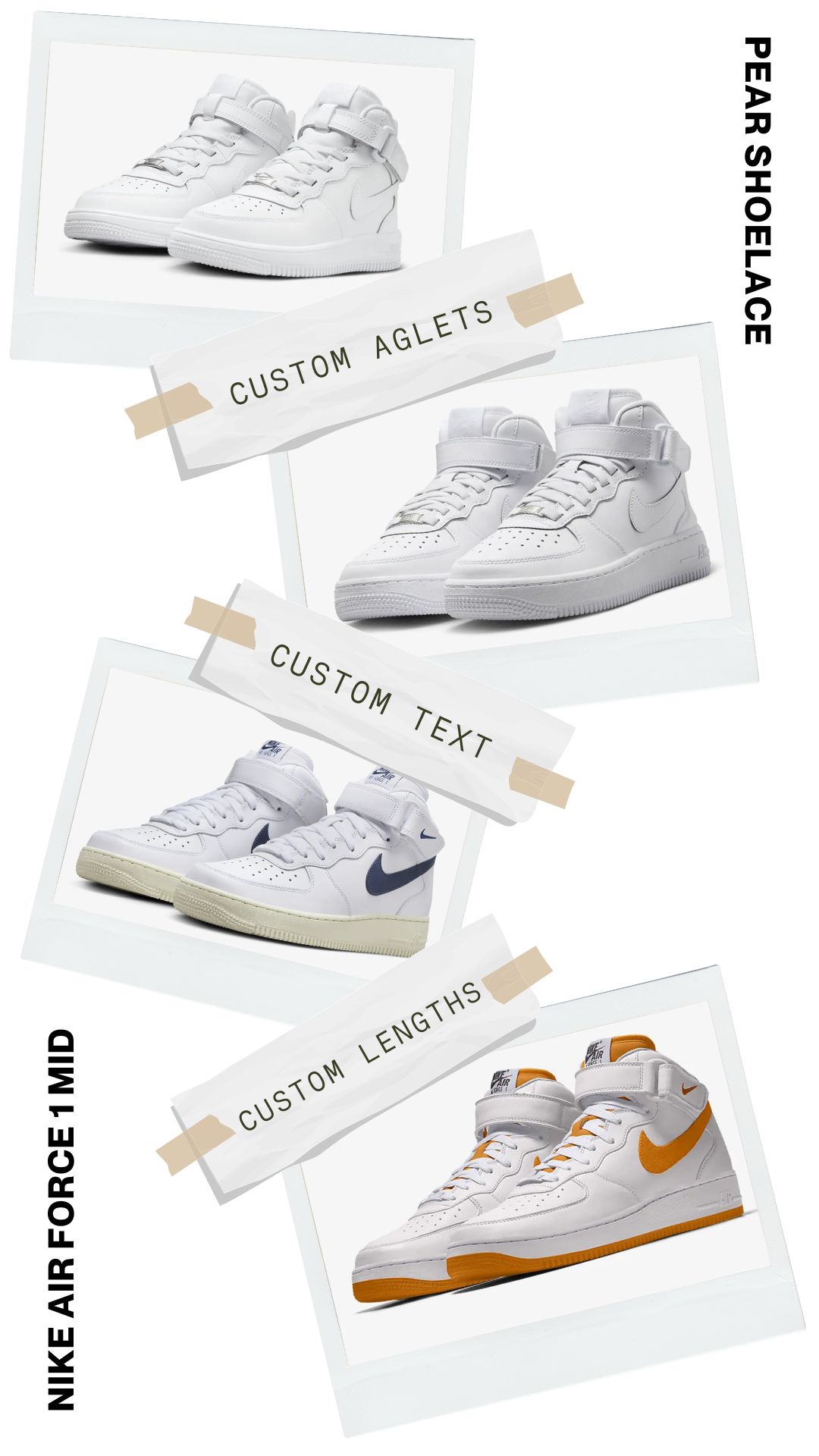 Reimagine your Nike Air Force 1 Mids today with our specialized replacement shoelaces. Customize with our range of lengths and aglet colours, and purchase now to revamp your beloved sneakers!