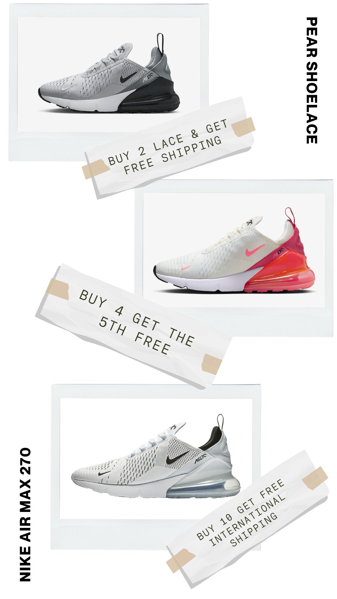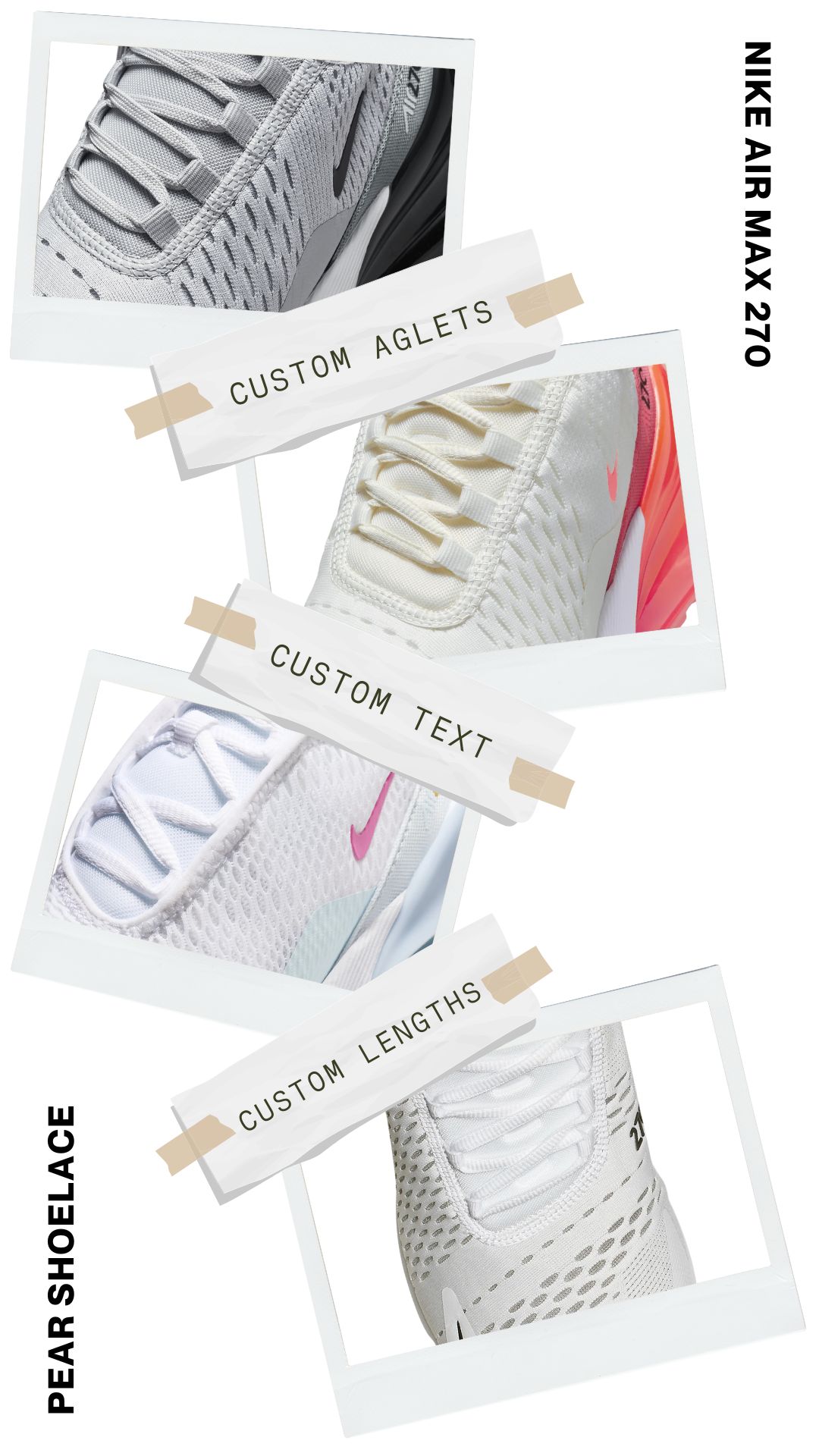 Say goodbye to ill-fitting laces with Pear Shoelaces. We offer custom lengths explicitly tailored for your Nike Air Max 270 sneakers, ensuring a perfect fit every time. Enjoy the ideal blend of comfort and style with laces designed just for you.
