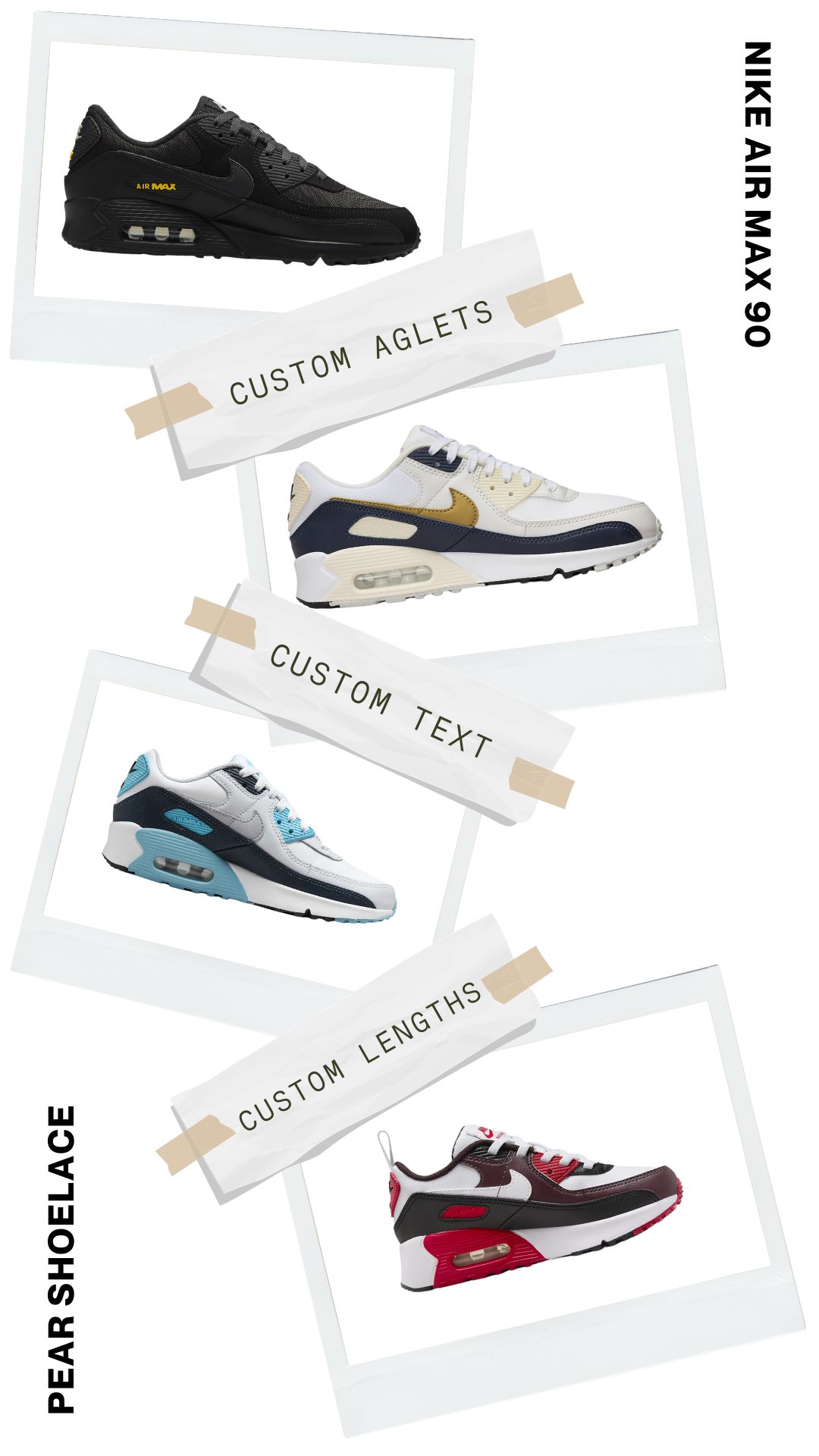 Express your individuality by adding custom text to your shoelaces. Whether it’s your name, a favourite phrase, or something uniquely personal, Pear Shoelaces allows you to make your Nike Air Max 90 truly one-of-a-kind.