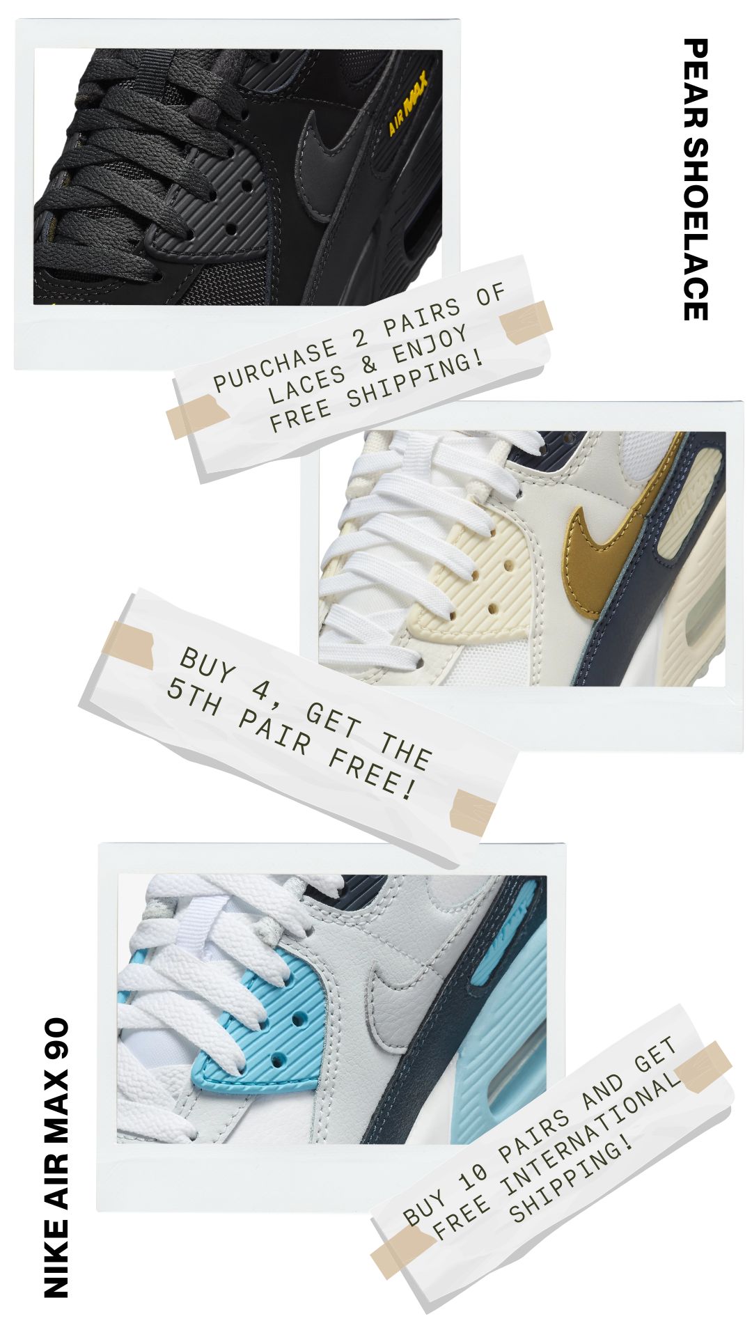 No more worrying about laces that are too long or too short. Pear Shoelaces offers custom lengths tailored for your Nike Air Max 90, ensuring they fit perfectly every time. Enjoy the ideal blend of style and functionality with just the right shoelace size.