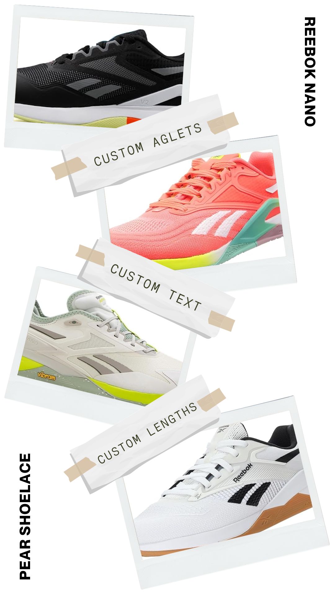 Say goodbye to ill-fitting laces with Pear Shoelaces. We offer custom lengths explicitly tailored for your Reebok Nanos, ensuring a perfect fit every time. Enjoy the ideal blend of comfort and style with laces designed just for you.