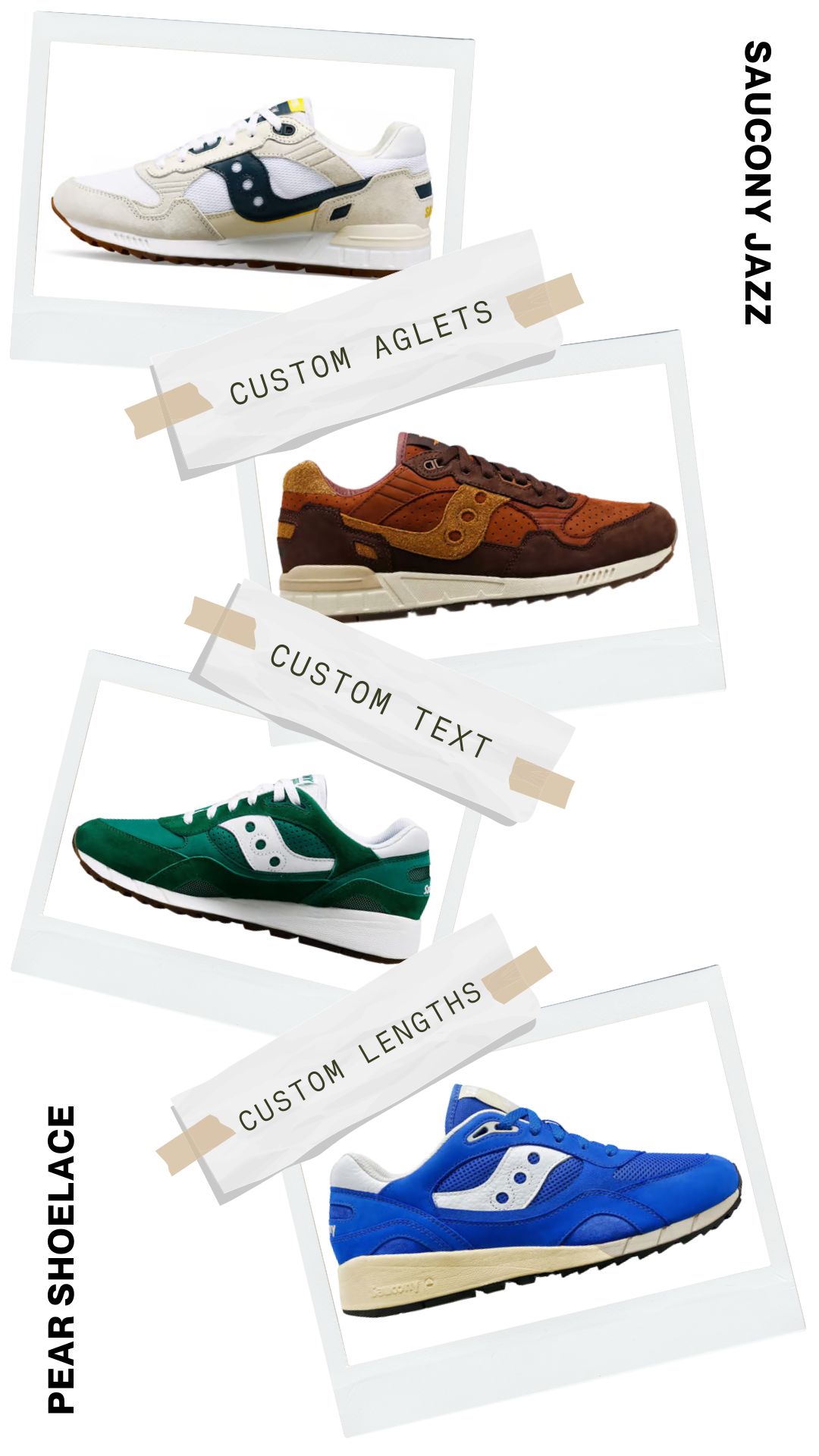Set your Saucony Jazz apart by adding custom text to your shoelaces. Whether it’s your name, a favourite quote, or something entirely personal, Pear Shoelaces lets you create a look that reflects your individuality.
