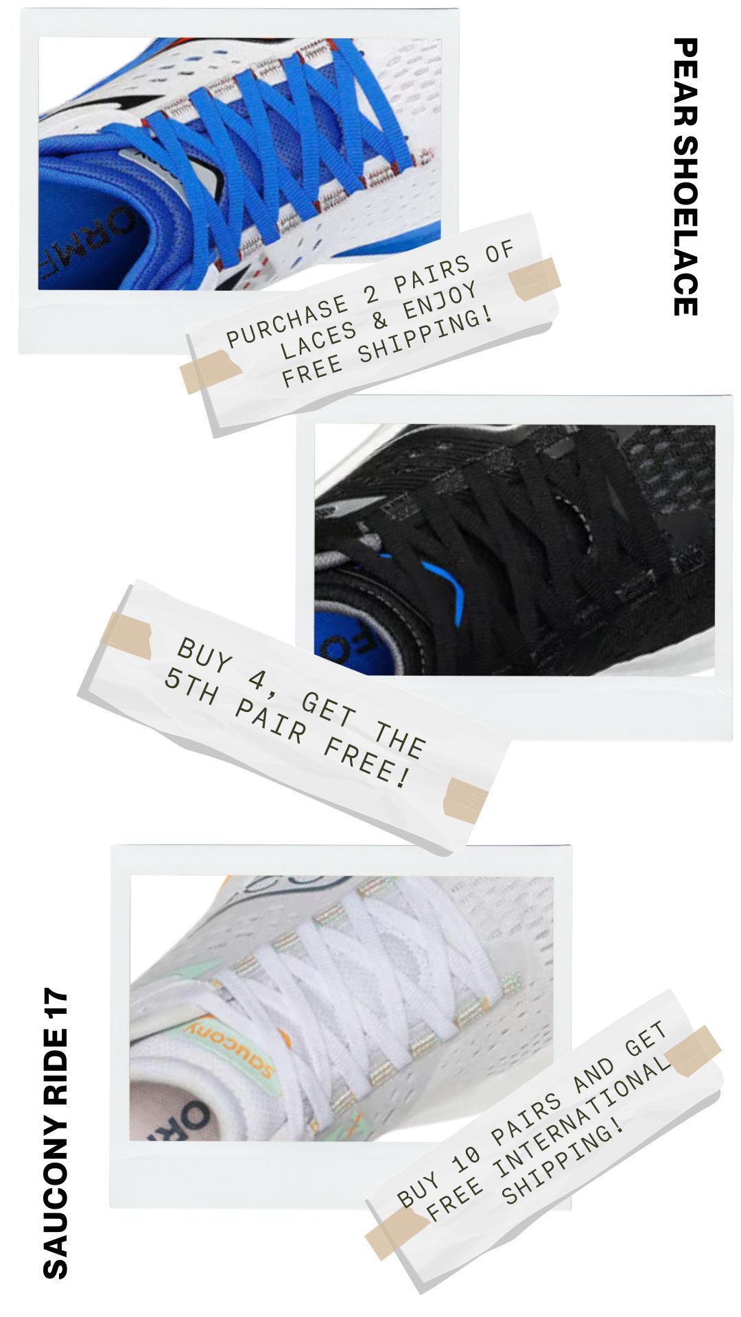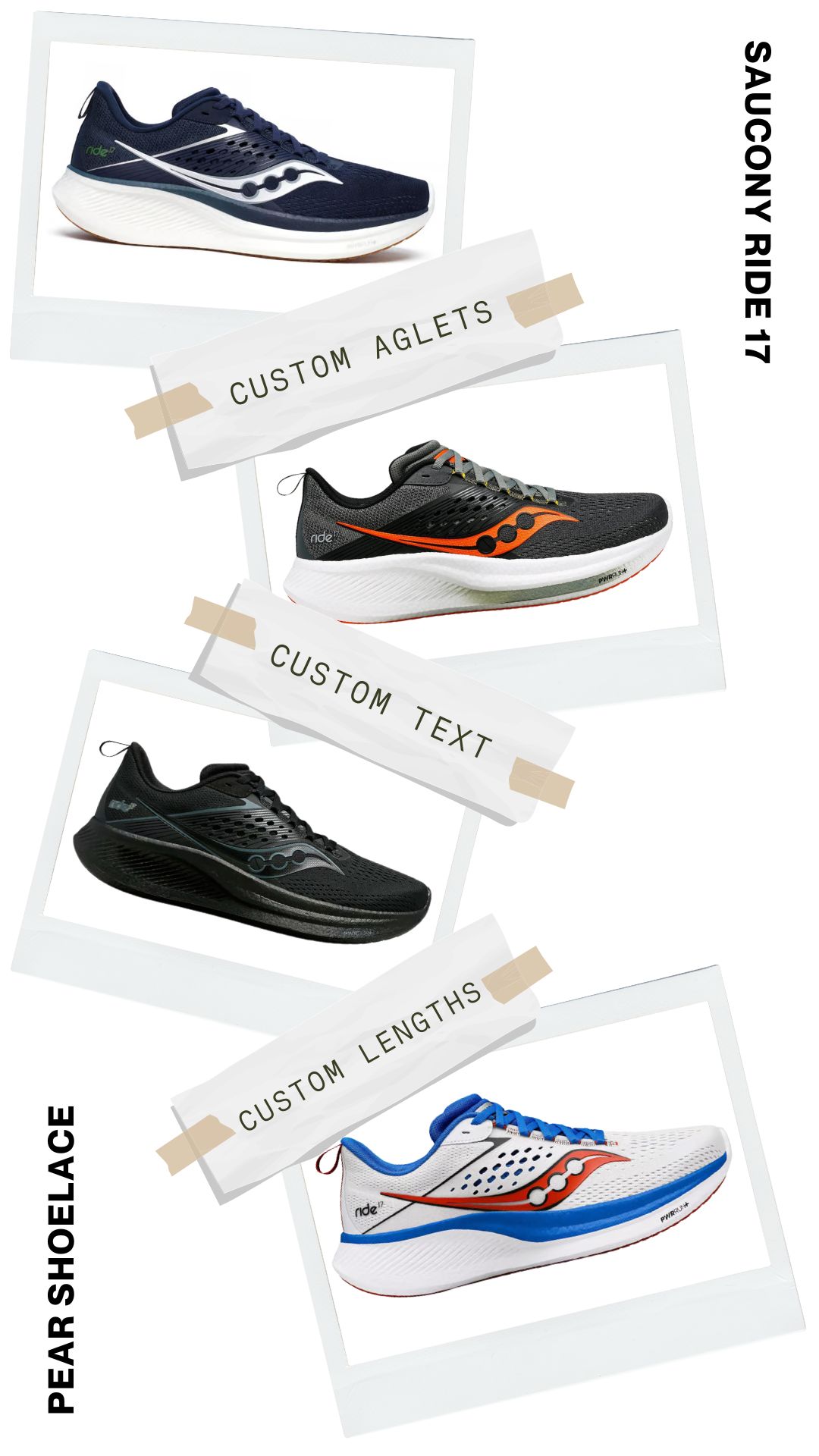 No more dealing with shoelaces that are too long or too short. Pear Shoelaces offers custom lengths explicitly tailored for your Saucony Ride shoes, ensuring a perfect fit every time. Enjoy the ideal combination of comfort and style with laces designed just for you.