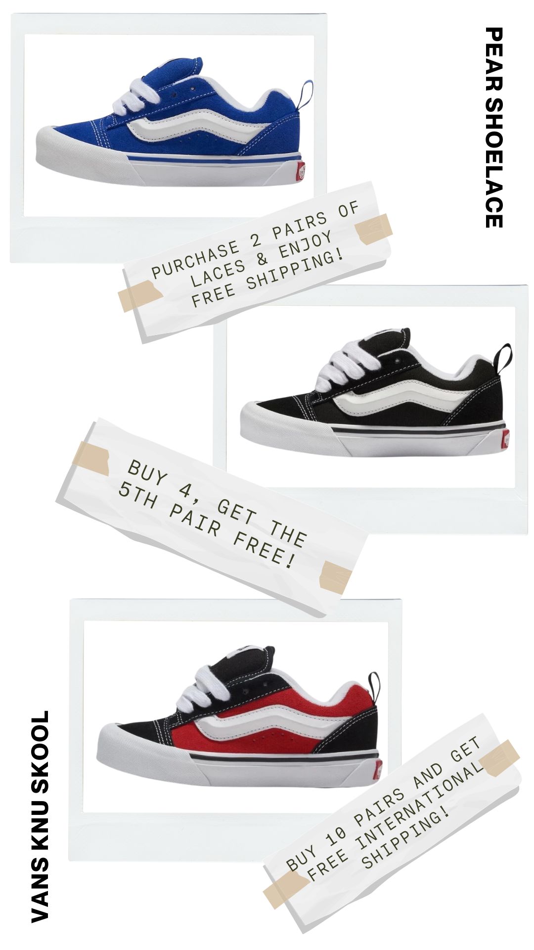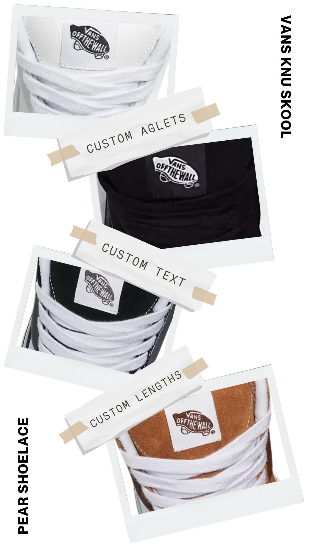 Say goodbye to laces that are too long or too short. Pear Shoelaces offers custom lengths crafted explicitly for your Vans Knu Skool, ensuring a perfect fit every time. Enjoy the comfort and style that come with laces made just for you.