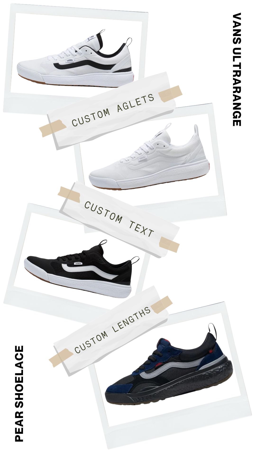 Upgrade your Vans UltraRange with our premium, customisable shoelaces. Explore our collection to find the perfect pair that matches your style. Shop now and give your sneakers the personalised touch they deserve with Pear Shoelaces!