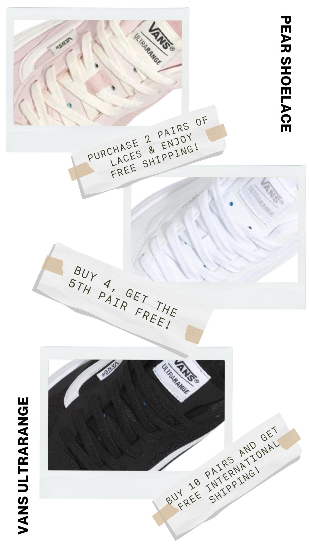No more dealing with laces that are too long or too short. Pear Shoelaces offers custom lengths explicitly tailored for your Vans UltraRange, ensuring a comfortable and secure fit every time. Enjoy the perfect blend of style and function with laces made just for you.