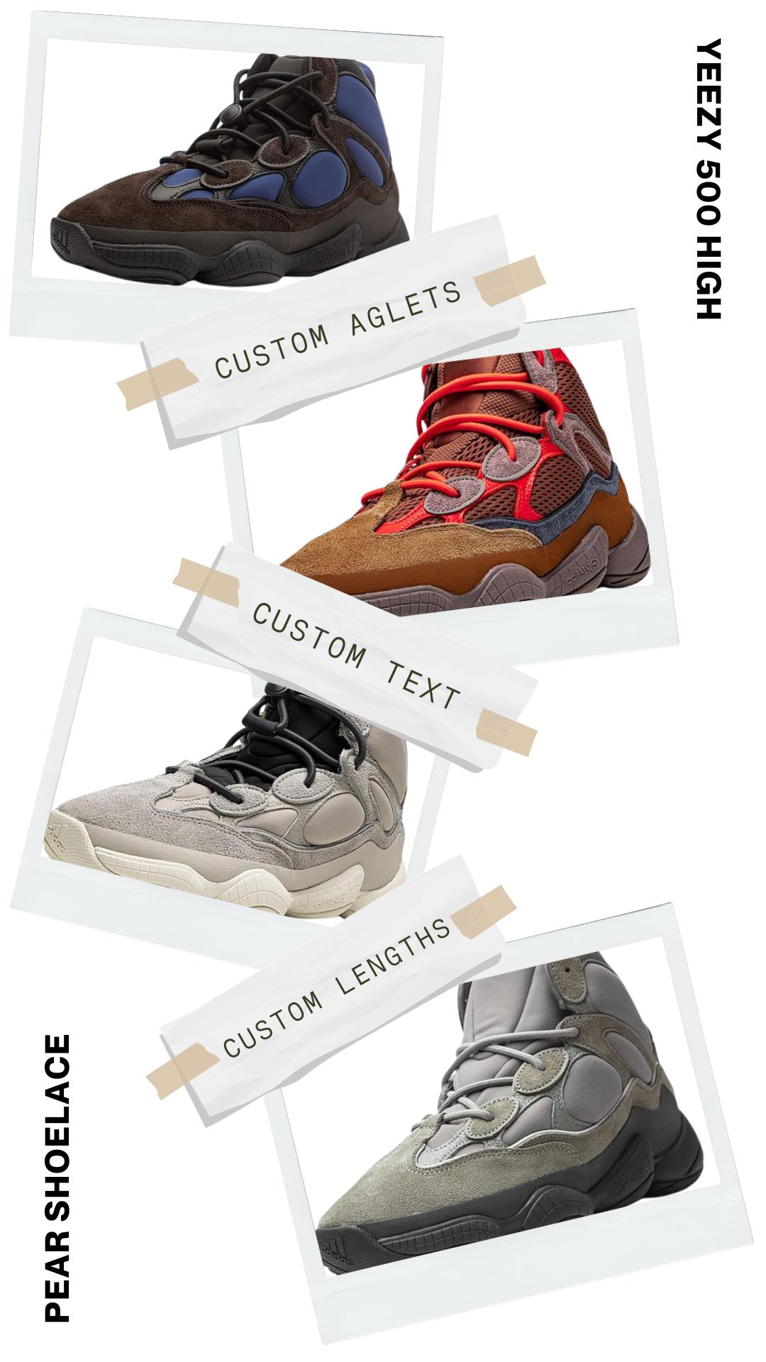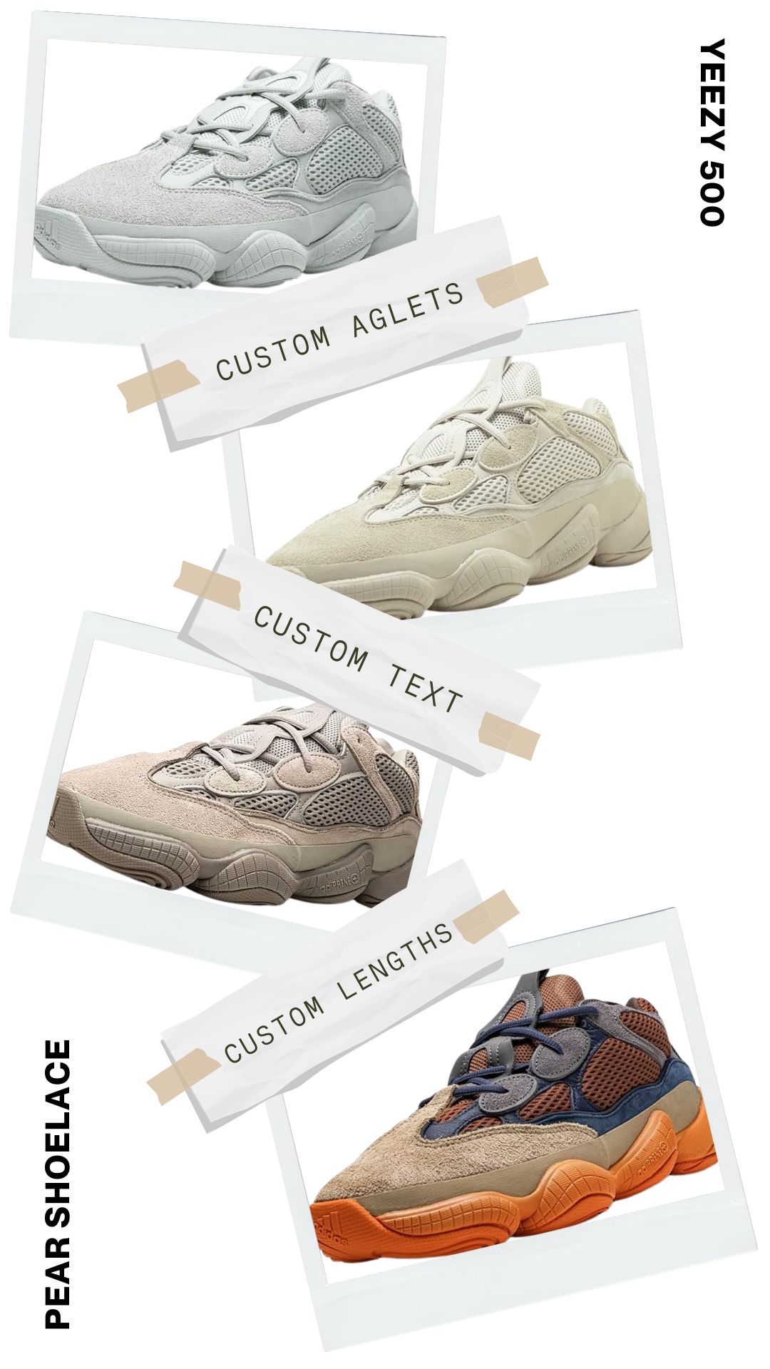 Say goodbye to ill-fitting laces with Pear Shoelaces. We offer custom lengths explicitly tailored for your Yeezy Boost 500 sneakers, ensuring a perfect fit every time. Enjoy the ideal blend of comfort and style with laces designed just for you.