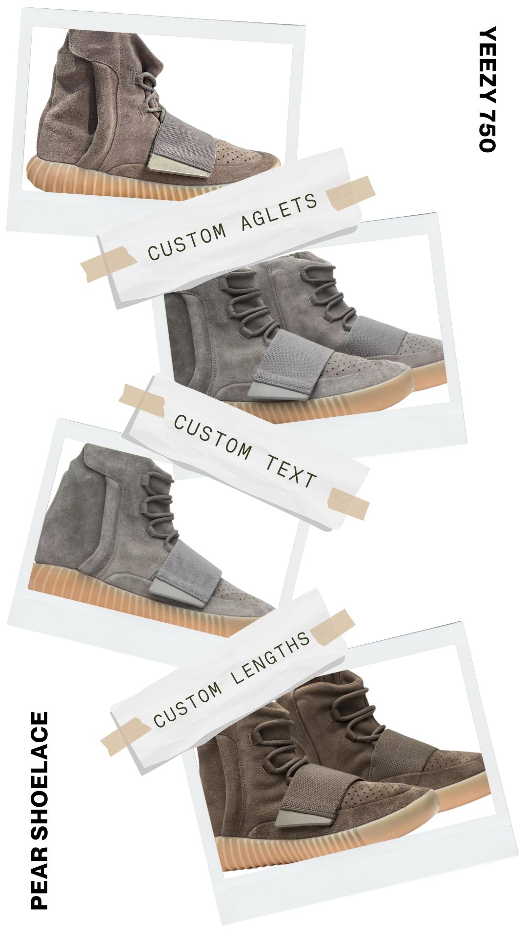 Say goodbye to ill-fitting laces with Pear Shoelaces. We offer custom lengths explicitly tailored for your Yeezy Boost 750 sneakers, ensuring a perfect fit every time. Enjoy the ideal blend of comfort and style with laces designed just for you.