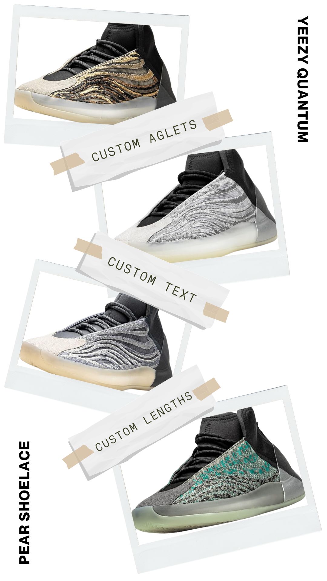 Say goodbye to ill-fitting laces with Pear Shoelaces. We offer custom lengths explicitly tailored for your Yeezy Quantum sneakers, ensuring a perfect fit every time. Enjoy the ideal blend of comfort and style with laces designed just for you.